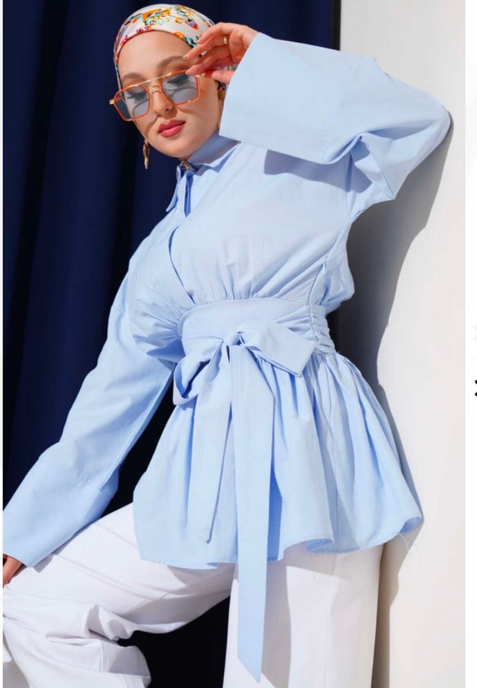 Kadın Mavi Pamuklu Uzun Kollu Kuşaklı Gömlek