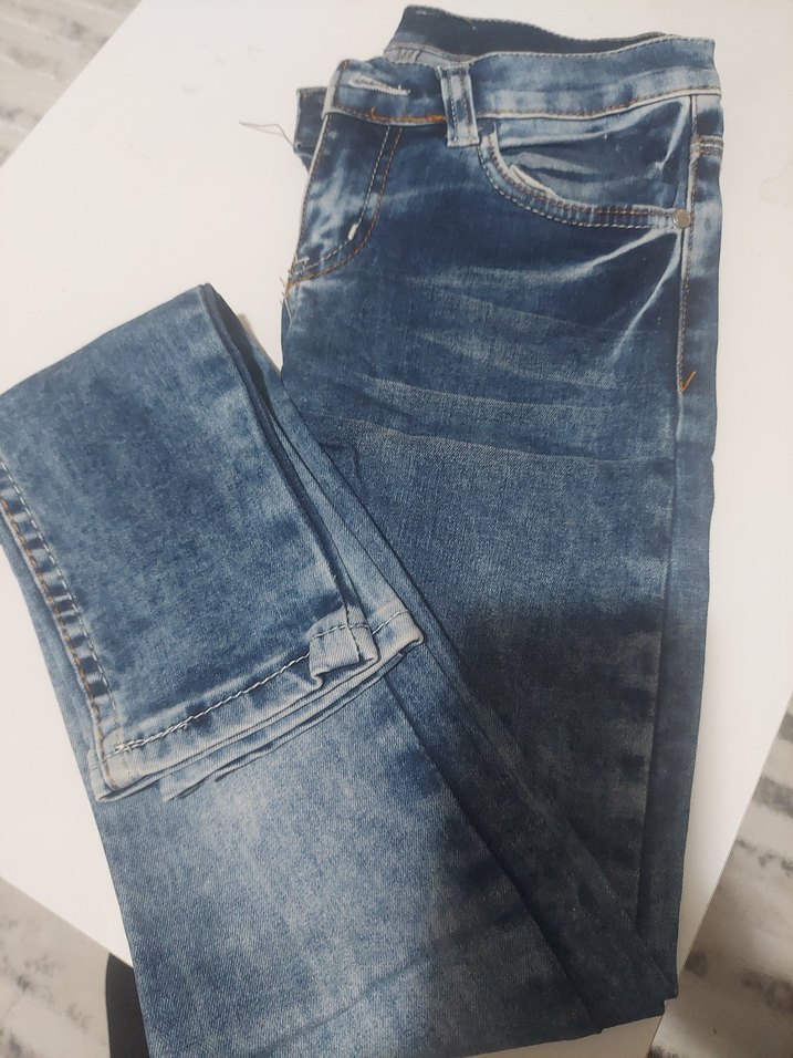 Kadınlar için regular fit, midi boy, kemerli mavi parlak denim jean. Sokak stili ve günlük kullanıma uygun.
