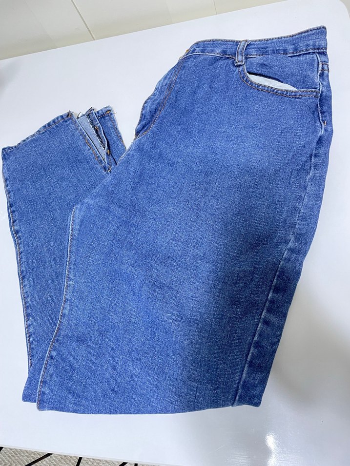 Kadınlar için regular fit, midi boyda, fermuarlı detaylı parlak mavi denim jean. Günlük, rahat sokak stili için uygundur.