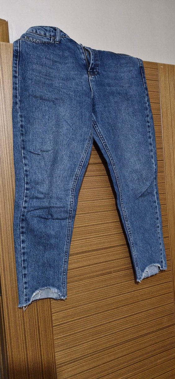 Kadınlar için parlak mavi renkte, normal boyda, regular fit denim jean. Paçalarında yırtmaç detayları bulunur, günlük sokak stili için uygundur.