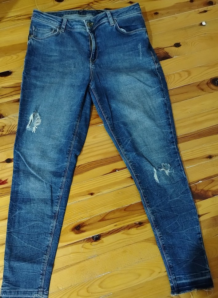 Kadınlar için parlak mavi renkte, rahat kesim ve normal boyda, yırtıklı denim jean. Günlük kullanıma uygun, hafif yıpranmış detaylara sahip sokak stili jean.