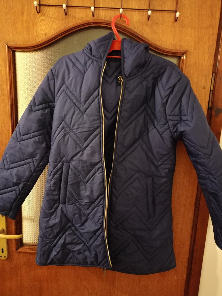 Kadınlar için dar kesim, parlak mavi renkte, fermuarlı, normal midi boyda, yumuşak ve sıcak kumaştan yapılmış mont.
