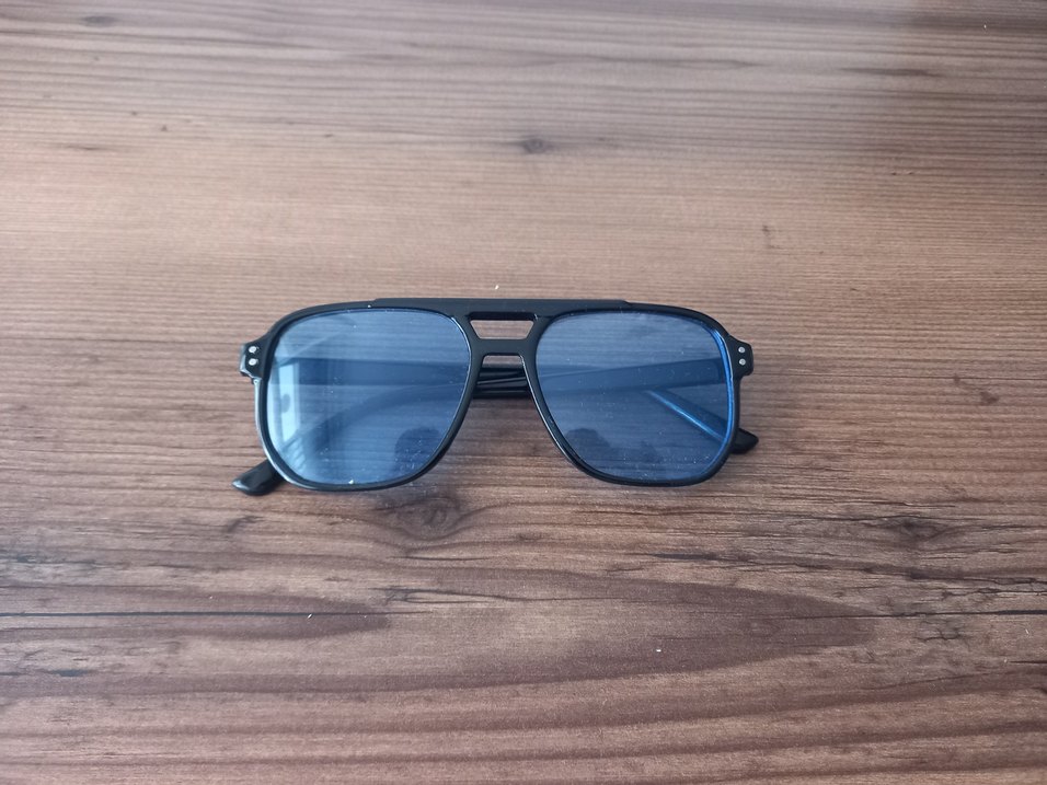 Kadınlar için parlak siyah çerçeveli, koyu mavi camlı, minimalist ve sade tarzda, hafif karşı kültür etkisi taşıyan gözlük. ️