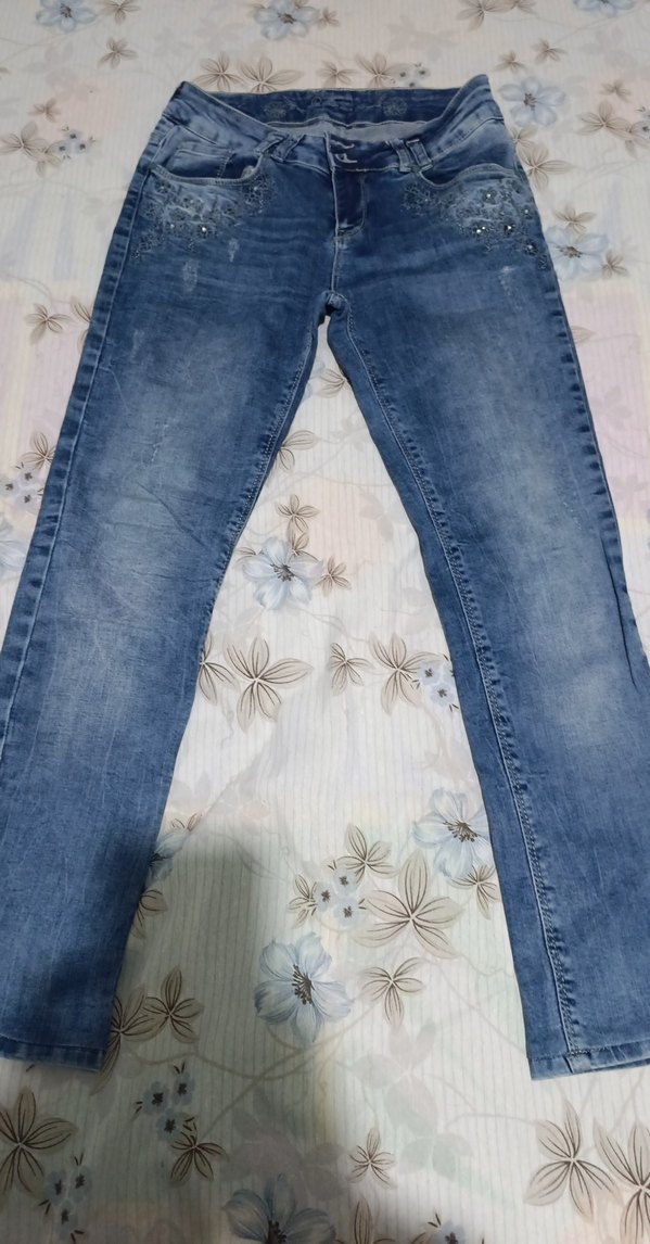Mavi denim, normal boy ve regular fit pantolon. Batik desenli ve payet detaylı, sokak stiline uygun. Günlük kullanıma uygun.