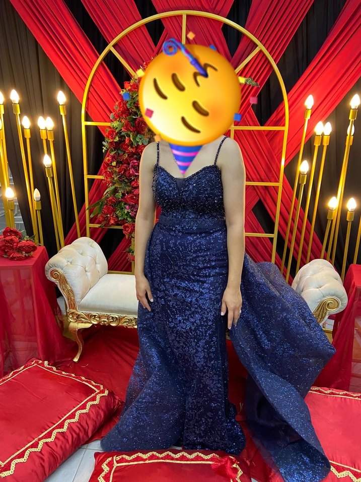 Mavi bağlama desenli, payetli detaylı, V yakalı ve askılı, kadınlar için vücuda oturan uzun abiye elbise. ✨