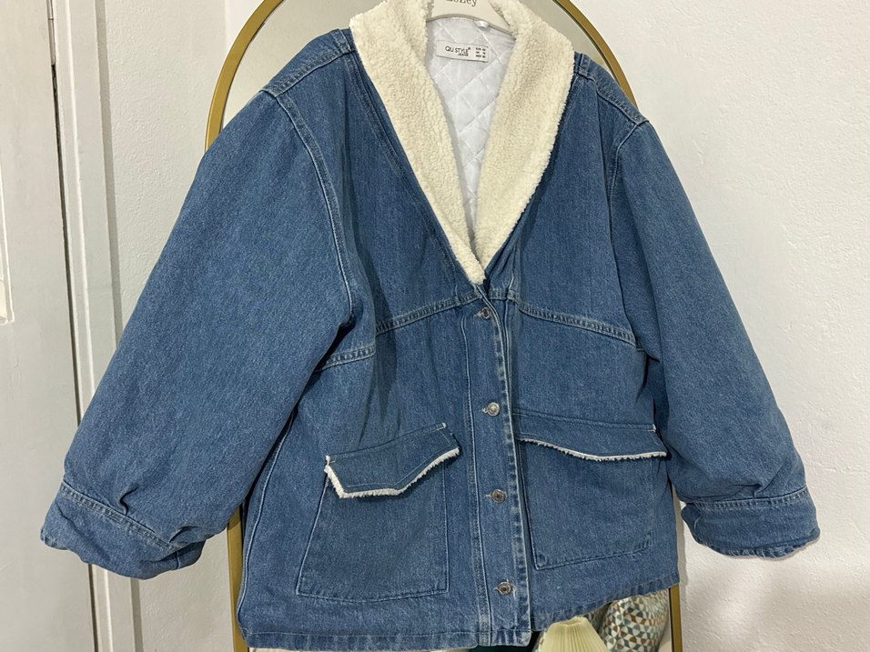 Kadınlar için mavi denim ceket, bol kesim ve uzun kolludur. Peluş detaylı iç yüzeyi, normal boyu ve kesik yaka tasarımıyla günlük rahat kullanıma uygundur.