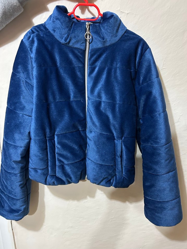 Fitted kesim, yüksek yakalı, peluş kumaşlı ve kürk detaylı mavi ceket. Uzun kollu, parlak ve rahat sokak stili ceket.