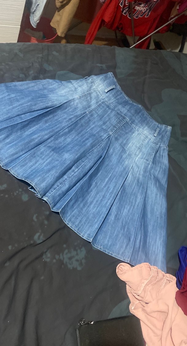 Mavi kot kumaştan, pileli ve midi boyda, bol kesim kadın eteği. Günlük ve sokak stiline uygun.
