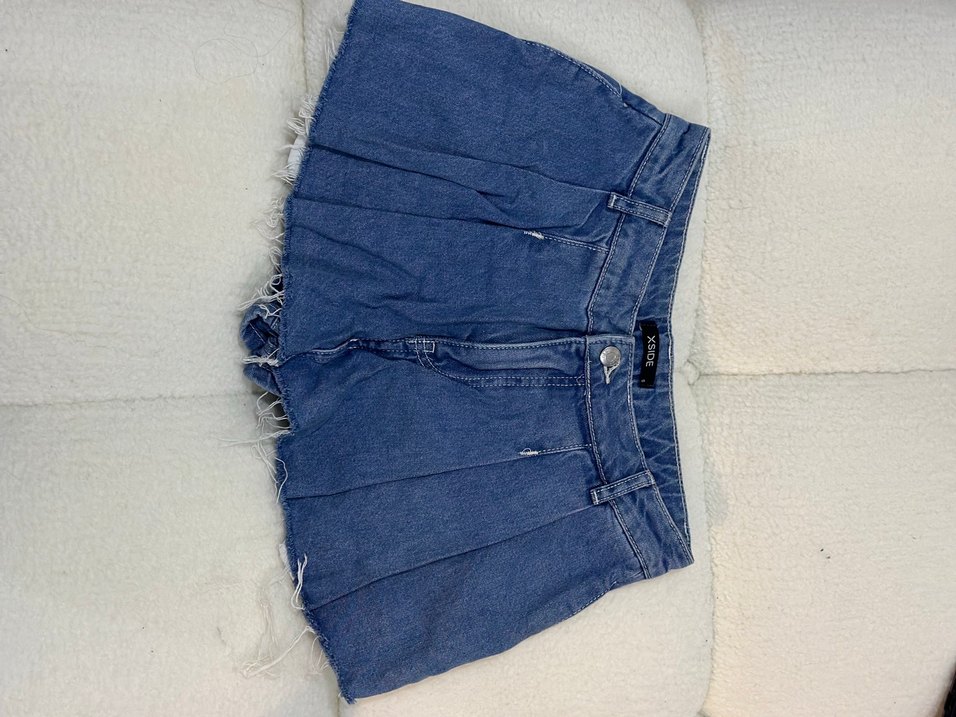 Mavi renkli, pileli detaylara sahip, bol kesim mini denim şort. Günlük kullanıma uygun, rahat ve sokak stiliyle uyumlu.