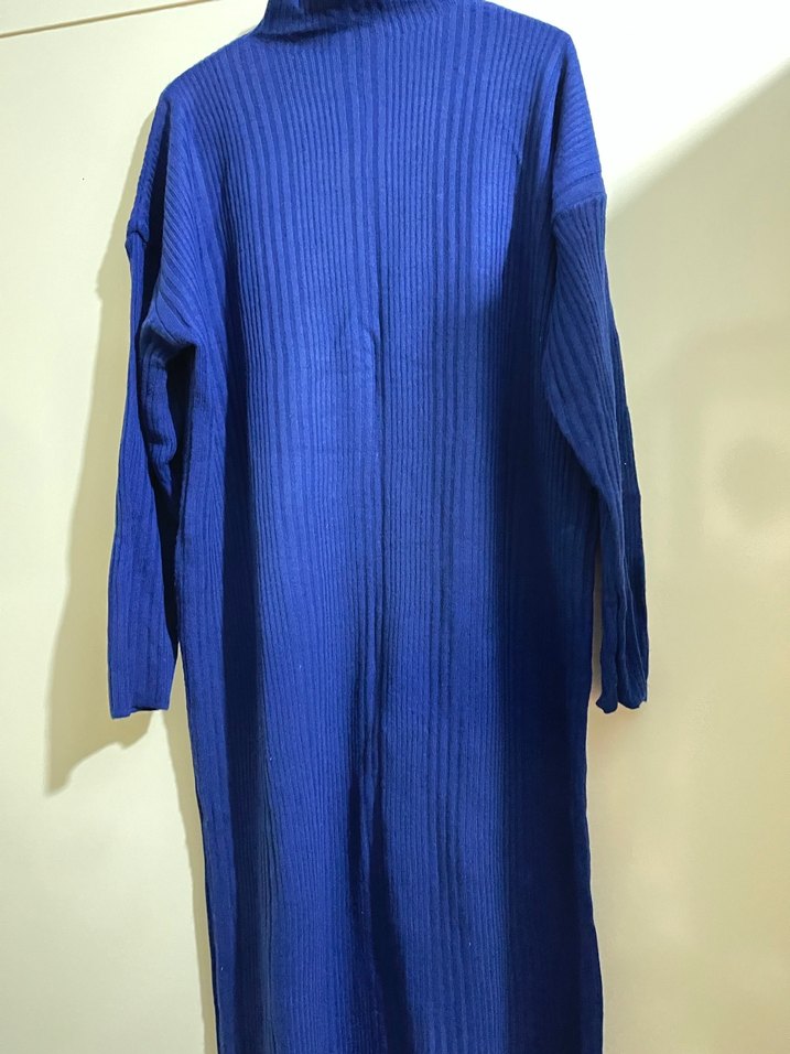 Kadınlar için mavi renkte, pilili dokulu ve boğazlı yakalı, uzun kollu. Yumuşak sentetik kumaştan, boyda ve rahat bir kullanıma uygundur.