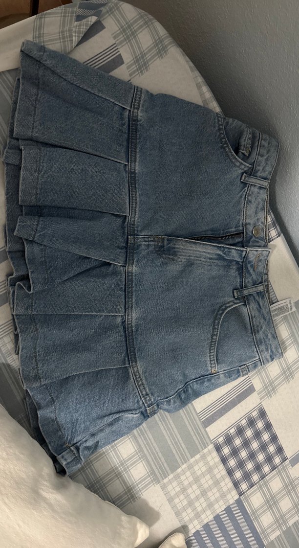 Pilili detaylara sahip, bol kesim kadın mavi denim mini etek. Günlük kullanıma uygun, desen içermeyen midi boy sokak stili etek.