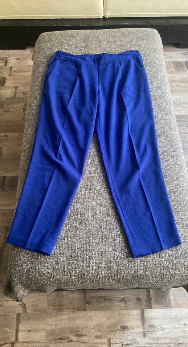 Kadınlar için normal kesim, pilili ve midi boyda mavi parlak kumaş pantolon. Yumuşak ve sıcak dokuda, ofis için uygundur.