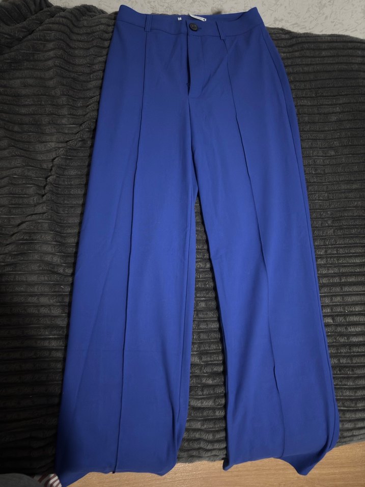 Kadın mavi kumaş pantolon, regular fit ve midi boyda, pilili detaylarıyla şık bir ofis görünümü sunar. Hiç giymedim