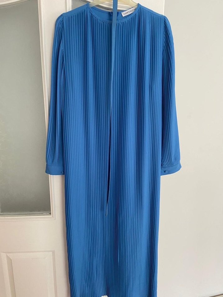 Mavi pilili, uzun kollu ve yüksek yakalı, bol kesim kadın elbisesi. Ofis için uygun, ipeksi dokulu ve sade tasarım. Kemerinde renk bozukluğu var