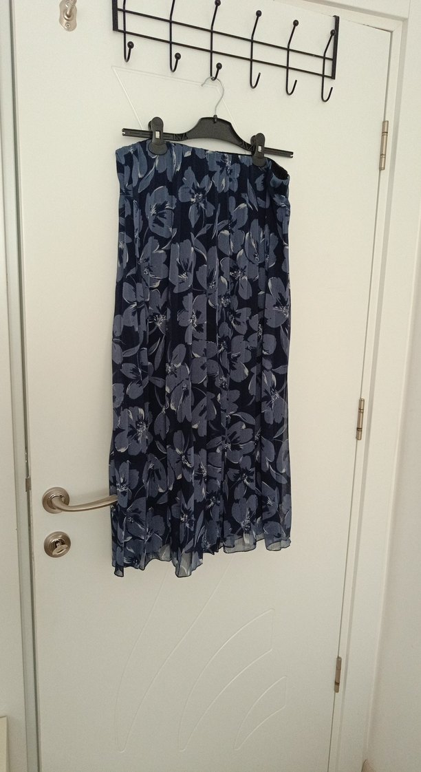 Kadınlar için pilili detaylara sahip uzun etek, bol kesimlidir. Yumuşak sentetik kumaştan yapılmış, koyu mavi batik desenlidir. Minimalist gotik tarzıyla günlük kullanıma uygundur.