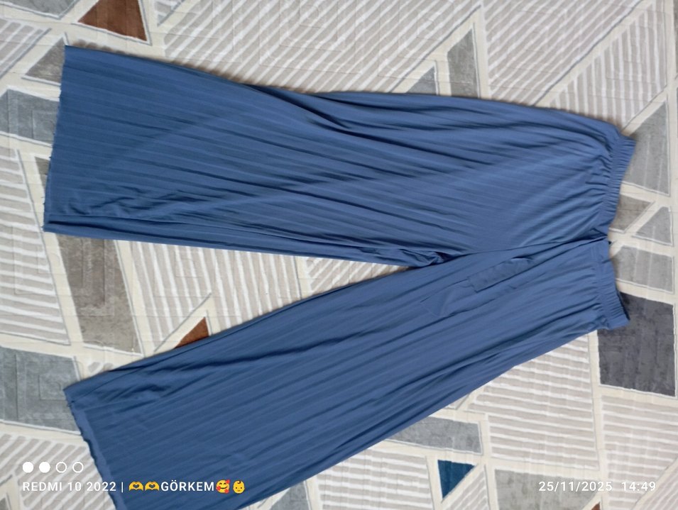 Kadınlar için mavi renkte, pilili ve vücuda oturan uzun kumaş pantolon. Sentetik kumaşı pürüzsüz ve şık dokudadır.