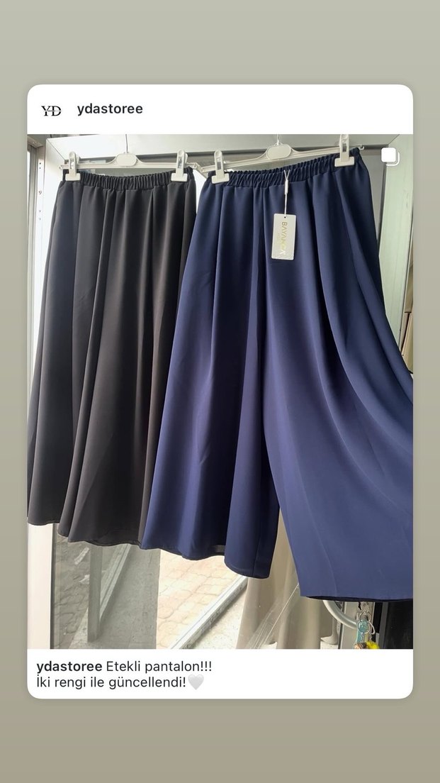 Kadınlar için koyu mavi renkte, piliseli ve etek görünümlü midi boy bol kesim pantolon. Yumuşak sentetik kumaş ve lastikli bel içerir.