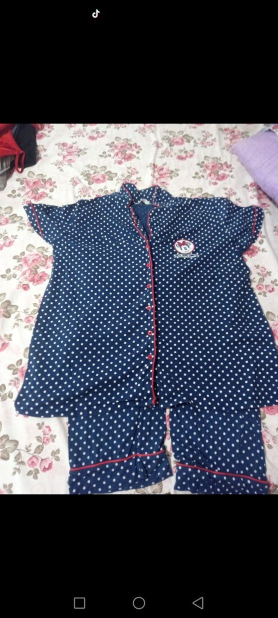 Kadınlar için bol kesim, kısa kollu ve uzun paça pijama takımı. Mavi zemin üzerine beyaz puantiyeli, kırmızı şerit detaylı, rahat ve konforlu uyku kıyafeti. Altında çok az renk açılması vardır