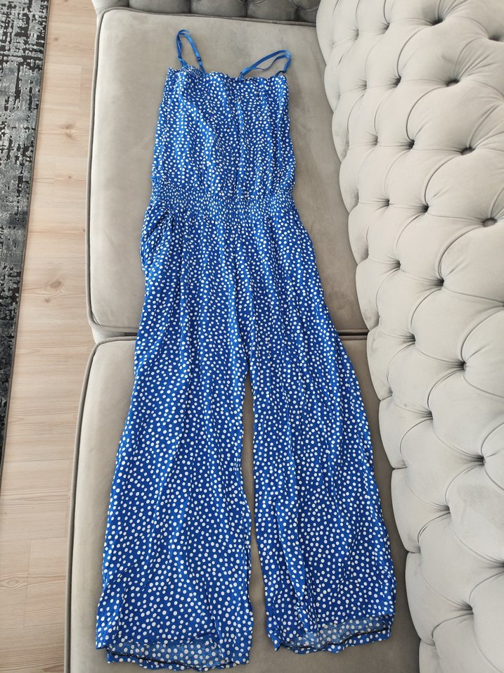 Kadınlar için askılı, straplez yakalı, bol kesim tulum. Yumuşak kumaştan, pileli ve renkli mavi puantiyeli desene sahip, günlük kullanıma uygun. cepli ,beli lastikli ,üst kısım lastikli ,M- L beden