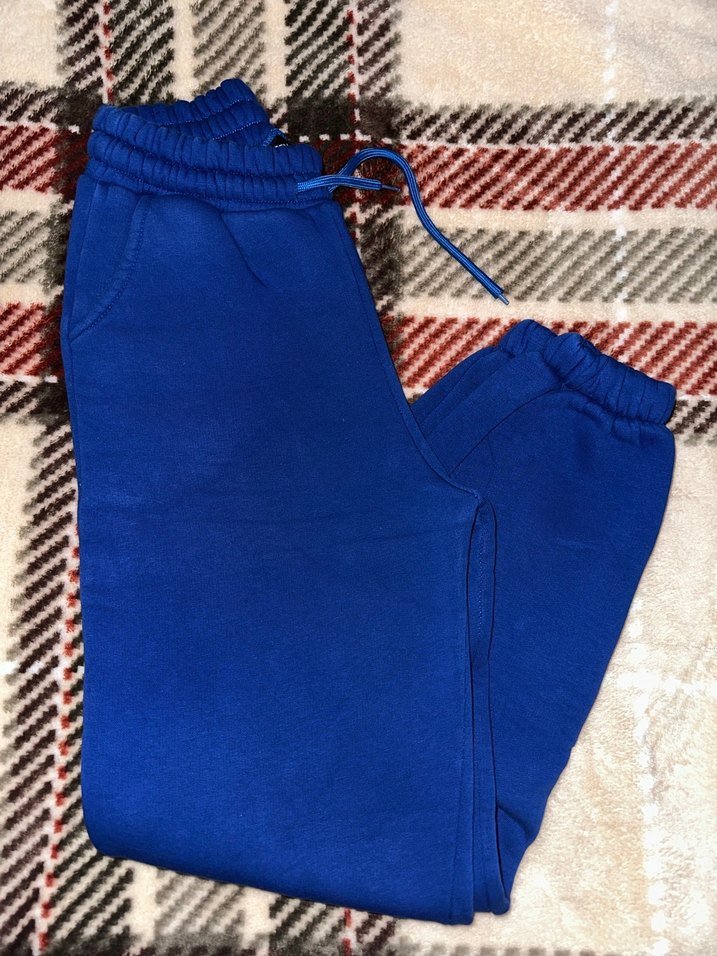 Yumuşak ve sıcak kumaştan, elastik bel ve cepli, rahat kesim koyu mavi kadın sweatpant, günlük sokak stiline uygun.