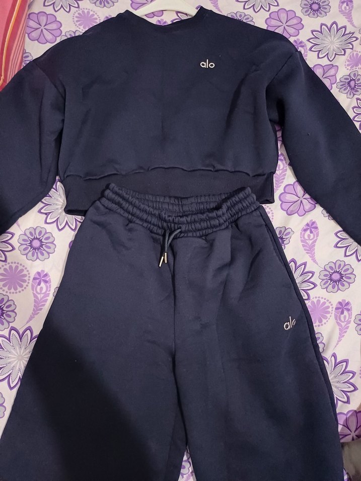 Kadınlar için rahat kesim, koyu mavi eşofman takımı. Uzun kollu, bisiklet yaka, sentetik kumaştan, fermuarlı ve "alo" logosu mevcut. Günlük kullanım için uygun.