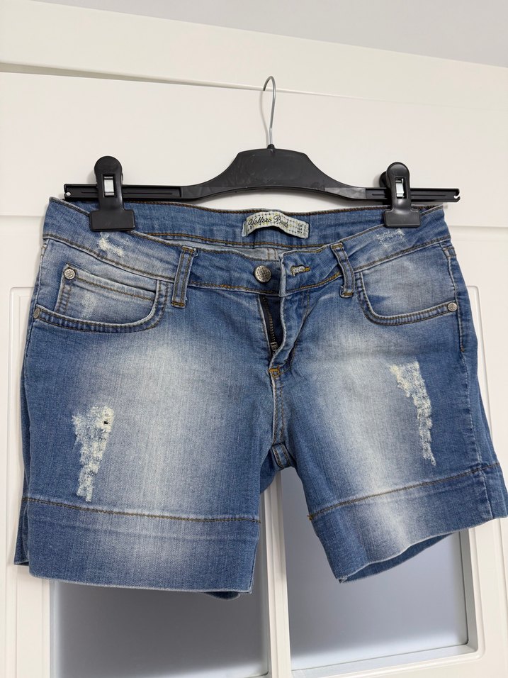 Mavi renkte, rahat kesim kadın kot şort. Tokalı detaylara ve hafif yıpranmış görünüme sahip. Sokak tarzı ve açık hava aktiviteleri için uygun.