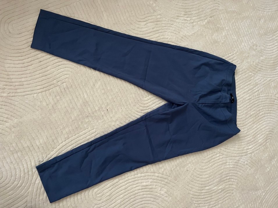 Kadınlar için mavi kumaş pantolon, rahat kesim ve normal boyda, elastik bel detayına sahip. Günlük kullanıma uygun sade tasarım. Hiç giyilmedi