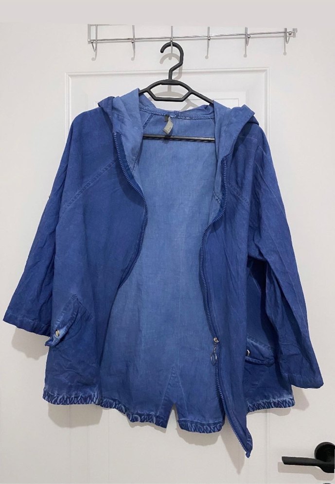 Kadınlar için rahat kesim, dökümlü ve yakalı midi uzunlukta parlak mavi denim ceket. Uzun kollu, desen içermeyen ve günlük sokak stili için uygun.