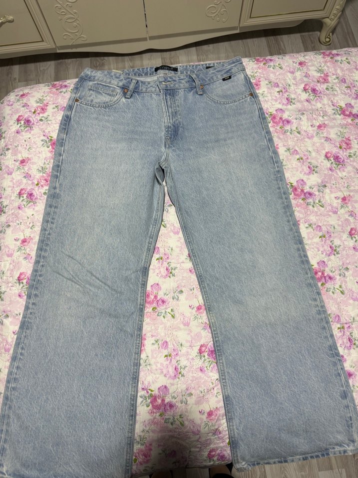 Kadınlar için rahat kesim ve midi boyda, pastel mavi renkte denim pantolon. Ibıza low rise loose straiğht