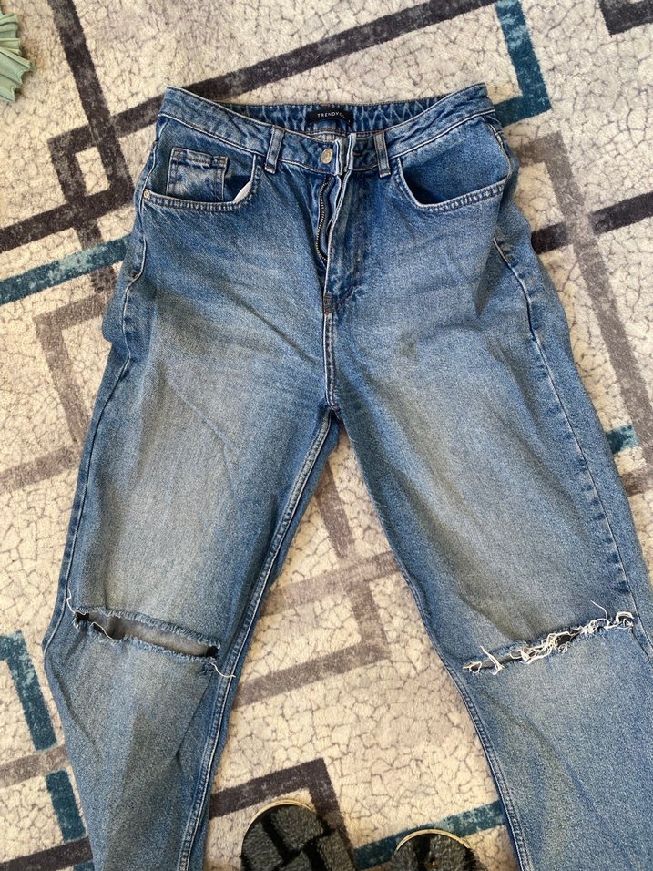 Kadınlar için mavi denim kot pantolon, rahat kesim ve midi boyda. Sokak stiline uygun, dizlerinde yırtık detaylar ve tokalı özellik içerir.