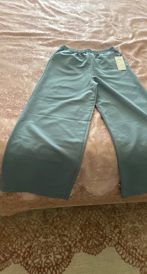Kadınlar için mavi kumaş pantolonlar, rahat kesim ve midi boyda, yumuşak sentetik kumaştan üretilmiştir. Sade tasarımı günlük kullanımda zahmetsiz şıklık sunar.