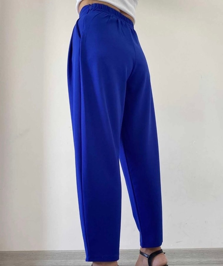 Gevşek kesim, mavi kumaş pantolon. Normal midi boy, elastik bel ve yumuşak, sıcak dokusuyla günlük rahat stil için uygun. Siyah rengi de mevcuttur
