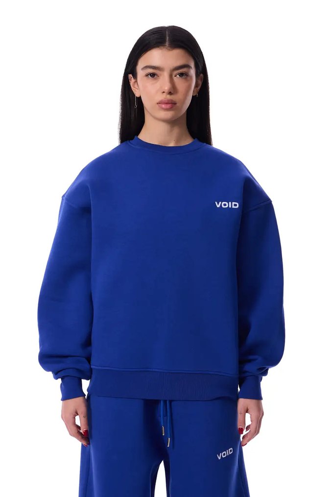 Bu koyu mavi sweatshirt, bol kesimi ve yumuşak polar kumaşıyla rahat ve zahmetsiz şıklık sunar. Günlük kullanım için uygundur ve üzerinde "VOID" yazısı bulunur.