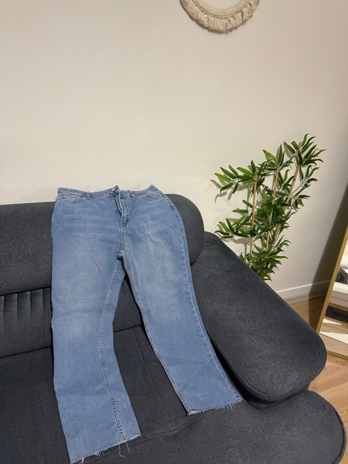 Kadınlar için mavi denim pantolon, regular fit ve midi boy kesime sahip, tokalı detay ile günlük kullanıma uygun.
