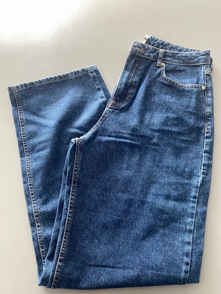Kadın mavi denim jean, regular fit ve midi boyda, rahat sokak stili ve zahmetsiz şıklık sunar, günlük kullanım için uygundur.