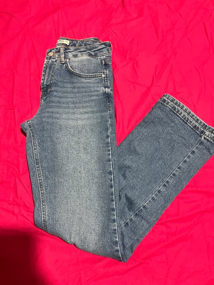 Mavi denimden yapılmış, regular fit kesime sahip, midi boy kadın kot pantolon. Bağcıklı detay ve gri tie-dye deseni günlük sokak stili için uygundur.