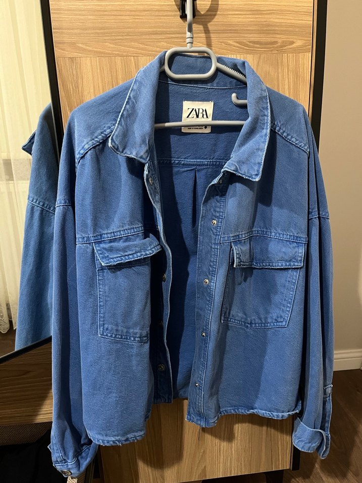 Salaş kesim, uzun kollu, düğmeli mavi denim ceket. Çentikli yakası ve göğüs cepleriyle gündelik sokak stiline uygun.