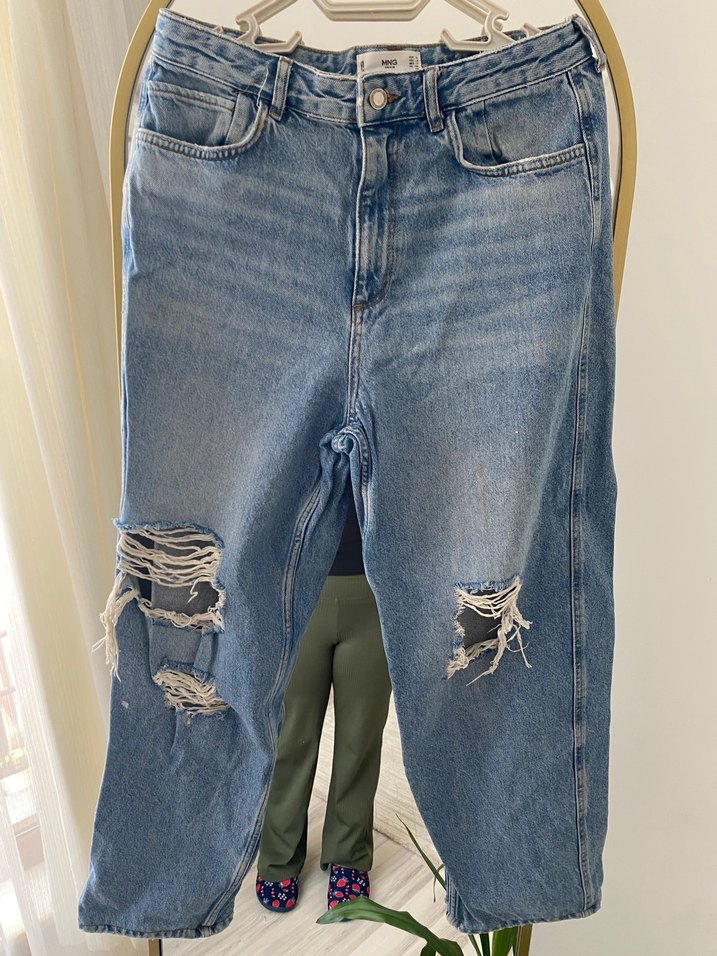 Mavi denimden yapılmış, salaş kesim ve midi boy kot pantolon. Bacaklarda yırtık detaylar ve tokalı bel tasarımı bulunur.