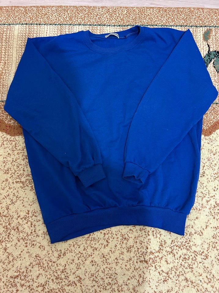 Kadınlar için parlak mavi renkte, yuvarlak yaka ve uzun kollu salaş kesim sweatshirt. Yumuşak ve sıcak kumaştan, günlük spor şıklığı için uygun.