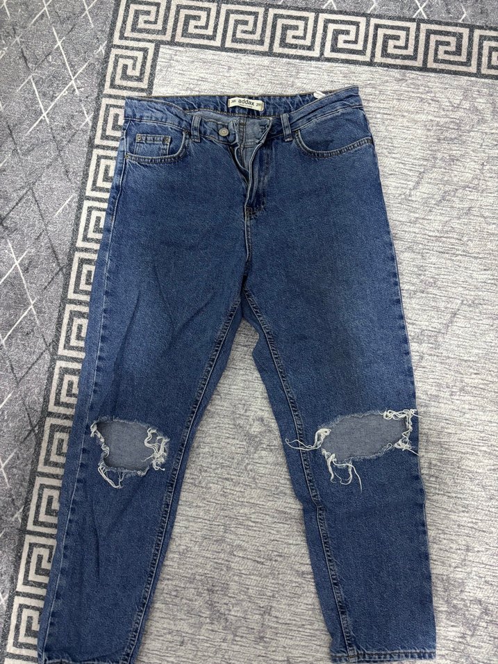 Dizlerde yırtık detaylı, salaş kesim mavi denim pantolon. Yırtmaçlı ve midi boyda, gündelik sokak stiline uygun.