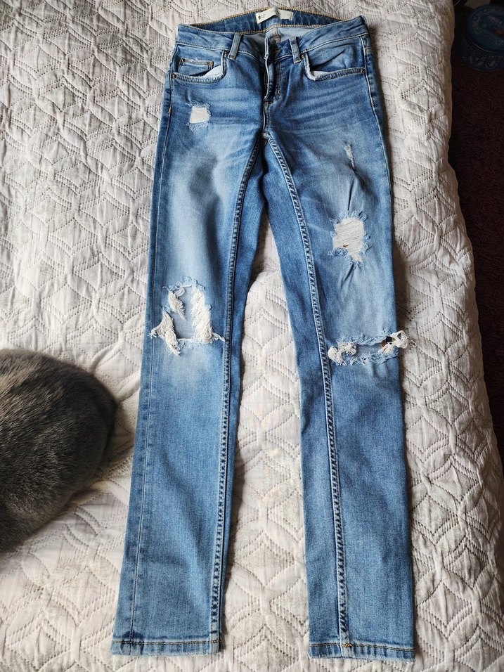 Kadınlar için mavi denimden, normal boyda, salaş kesimli yırtık jean. Rahat ve günlük sokak stili için uygundur.