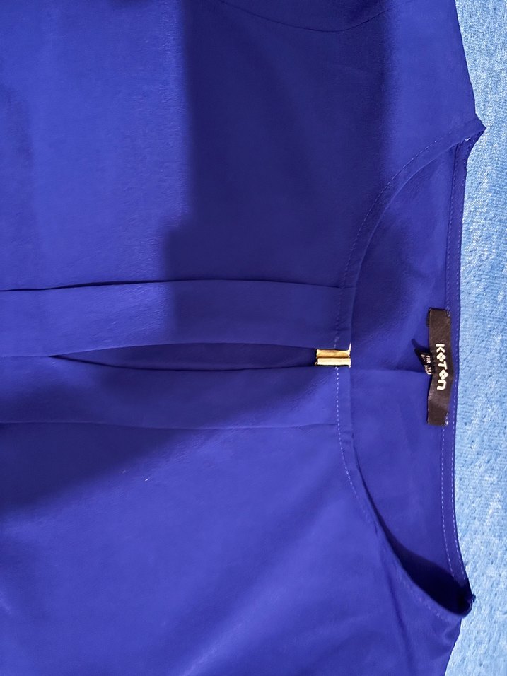 Kadınlar için parlak mavi, saten kumaştan kısa kollu, normal kesim ve yakasında fermuar detayı bulunan bluz. Ofis kullanımı için uygundur.