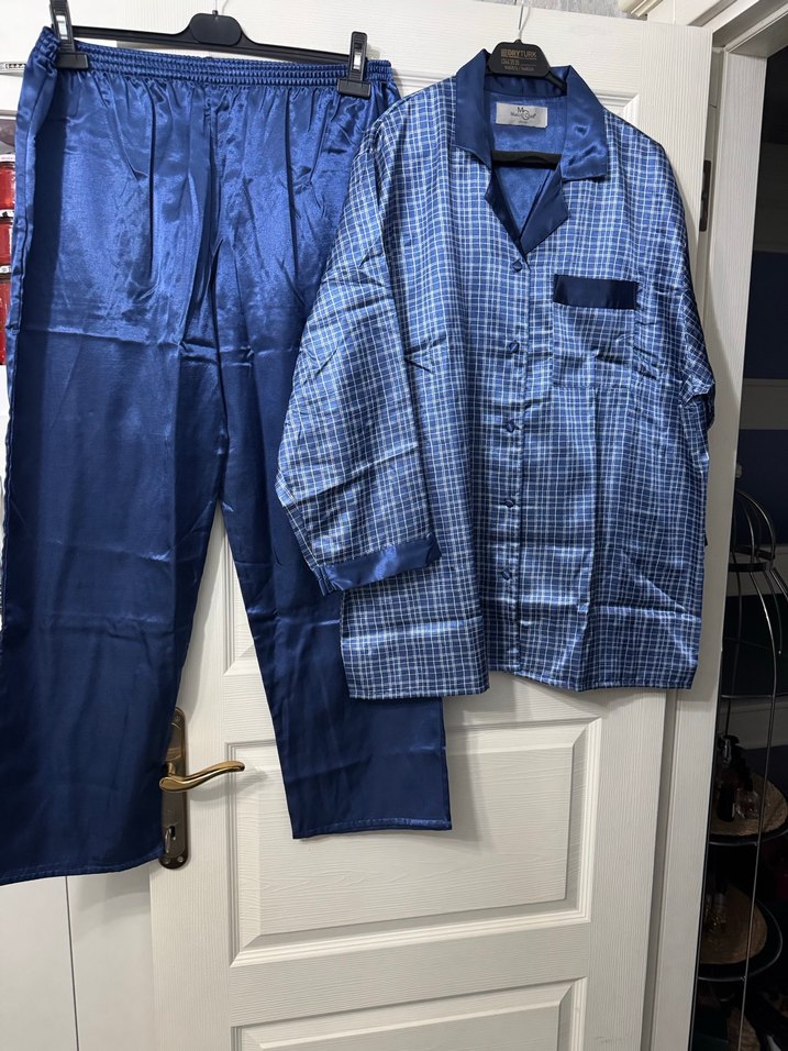 Kadınlar için parlak mavi saten kumaştan, uzun kollu düğmeli üst ve lastikli bel pantolonlu pijama takımı. Üstte hafif kare desen ve göğüs cebine sahiptir. Ürün Hıc kullanılmadı hefıte ıcın uygundur