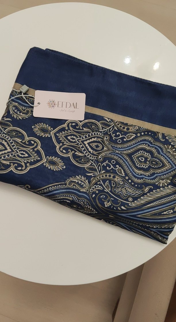 Kadınlar için koyu mavi saten kumaştan, vintage desenli ve fermuarlı şal. EIDAL markalıdır.