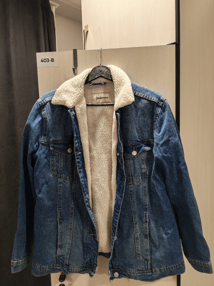 Kadınlar için rahat kesim ve kesik yaka detaylı, sıcak kürklü astarlı mavi denim ceket. Uzun kollu, normal boyda, günlük sokak stiline uygun.