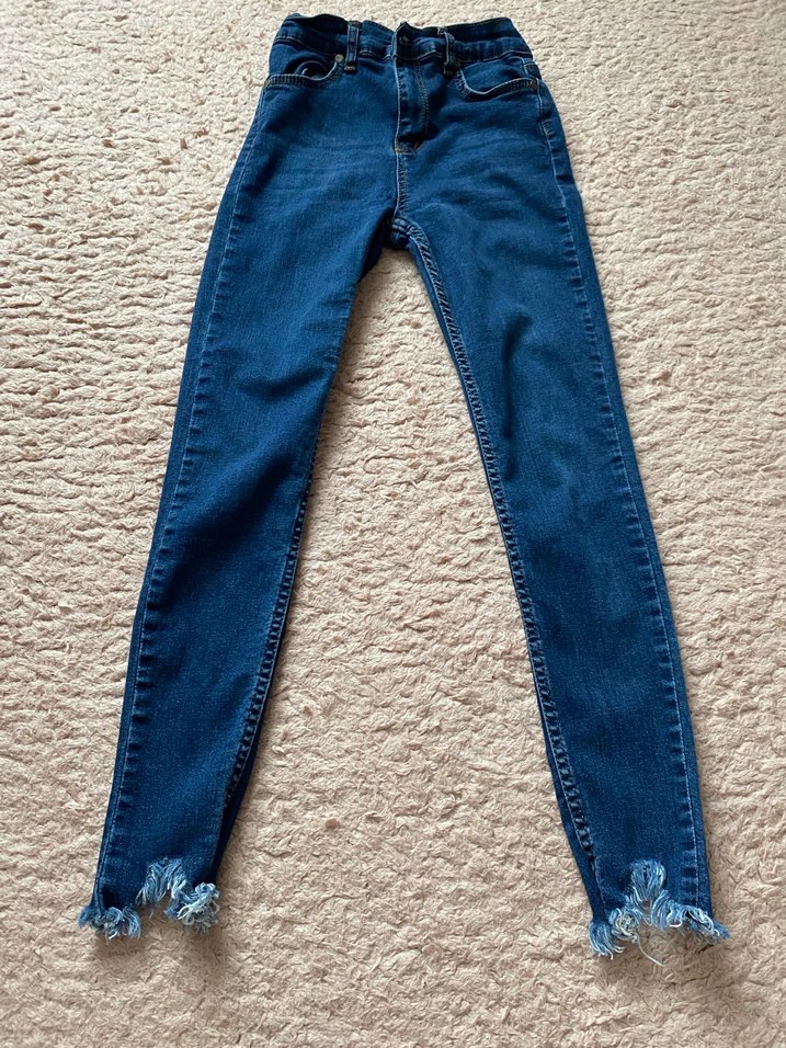 Kadınlar için sıkı kesim mavi denim kot pantolon, midi boy ve tokalı detaylı. Günlük kullanım için uygun, sokak stili ve yıpranmış paça uçlarına sahip.