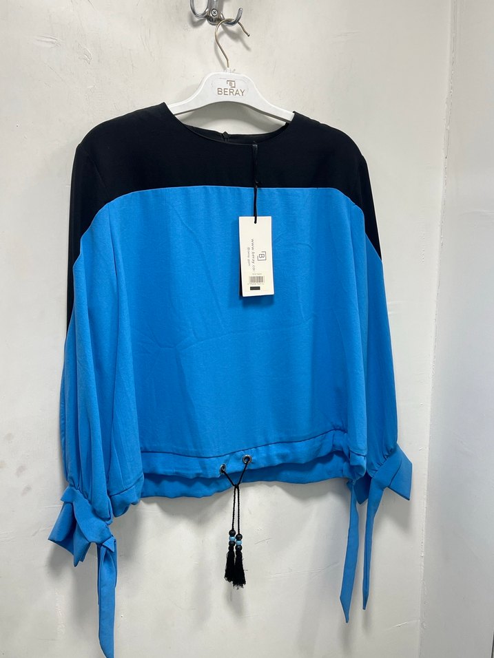 Kadınlar için uzun kollu, yuvarlak yakalı ve bol kesim mavi-siyah baskılı kuşaklı bluz.günlük sokak stiline uygun. Tek kalmıştır