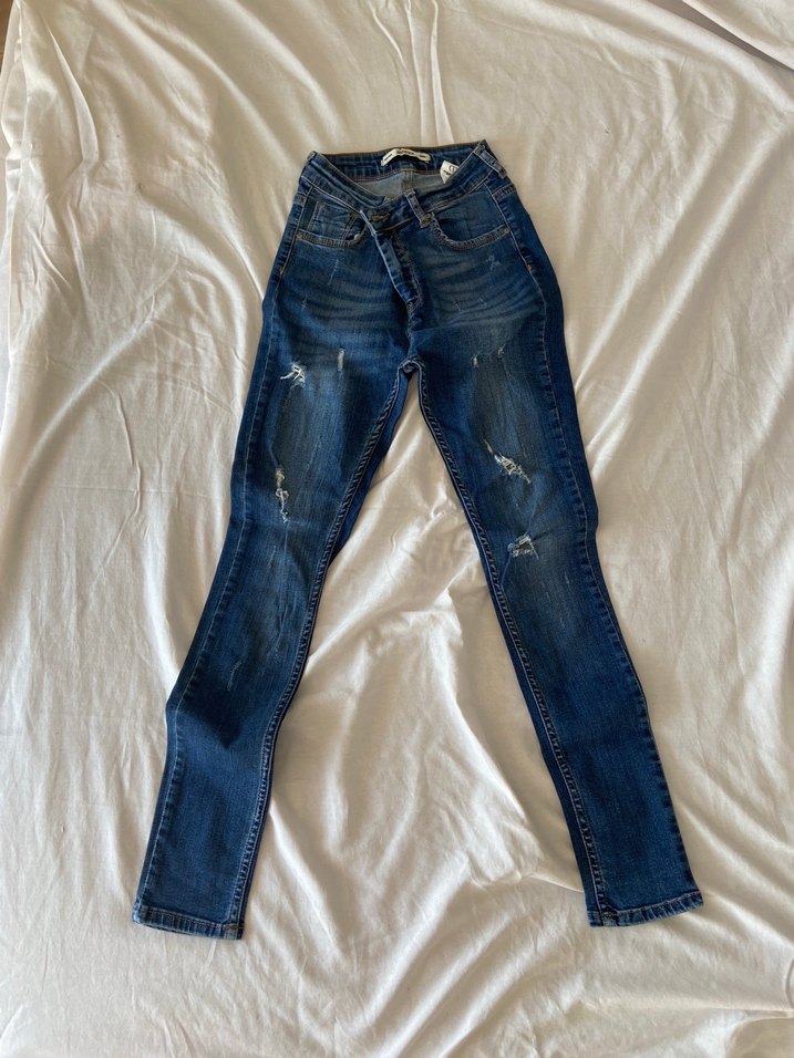 Kadınlar için mavi renkli, slim fit, kemerli denim pantolon. Günlük kullanıma uygun, hafif yıpranmış detayları ve midi boyu ile sokak tarzını yansıtır.