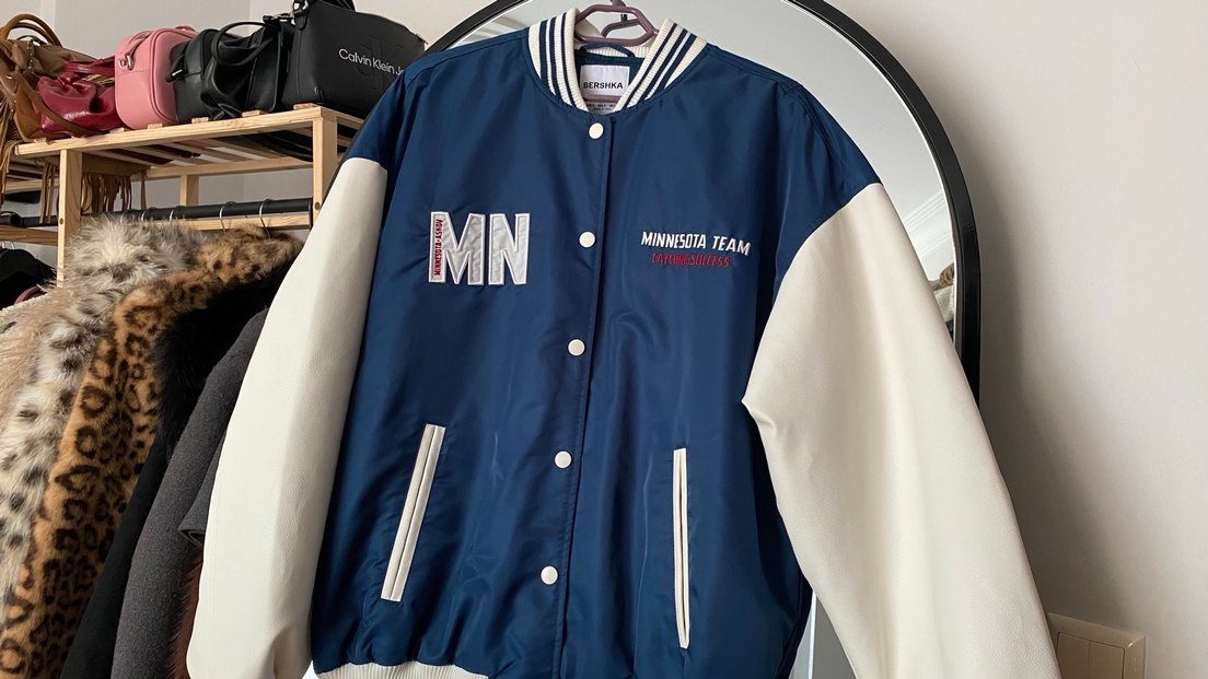 Kadınlar için mavi spor ceket, normal kesim, uzun kollu, yuvarlak yaka ve düğmeli. Önünde "MINNESOTA TEAM" baskısı bulunur, sentetik kumaştan üretilmiştir.