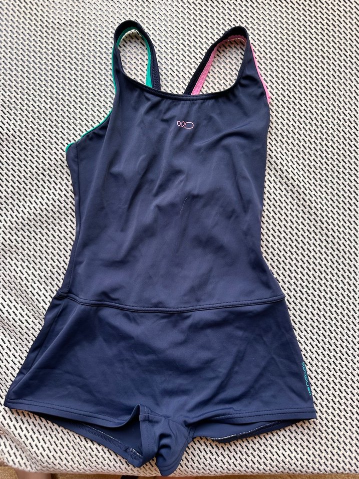 Kolsuz, mavi renkli kadın mayo, şortlu ve vücuda oturan kesimiyle spor ve sokak modası tarzında, rahat ve şık bir görünüme sahiptir. ♀️
